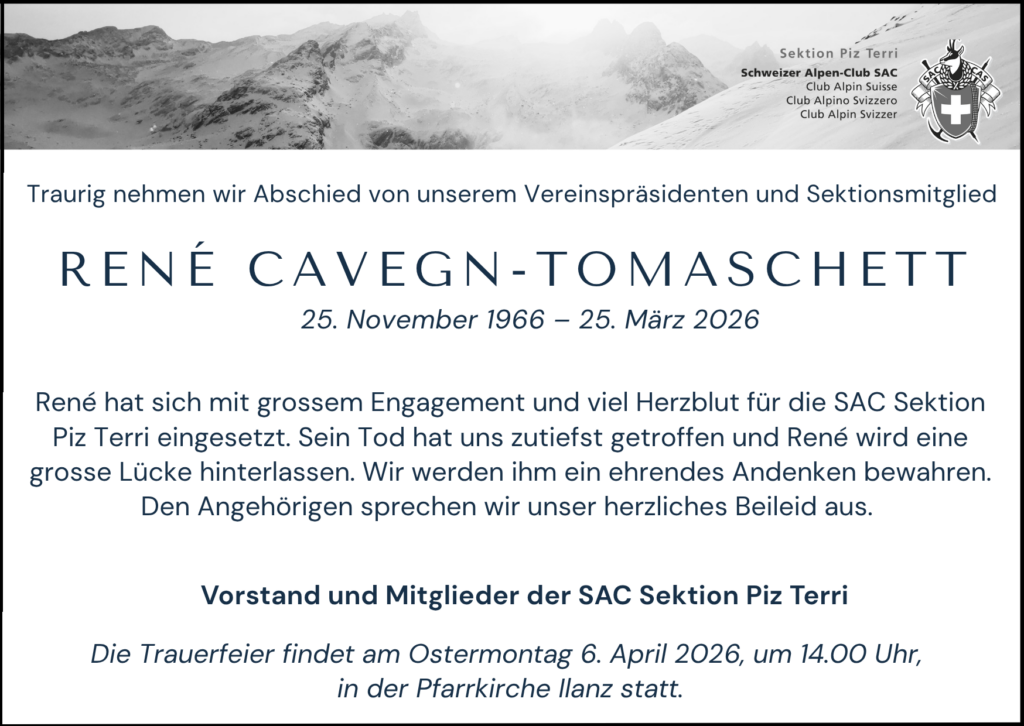 Zutiefst betroffen nehmen wir Abschied von unserem Vereinspräsidenten René Cavegn-Tomaschett. Er war im November neu zu unserem Vorstand gestossen und brachte sich von Anfang an mit grossem Engagement und viel Elan ein. Wir waren sehr dankbar, ihn als unseren Präsidenten gewinnen zu dürfen.
